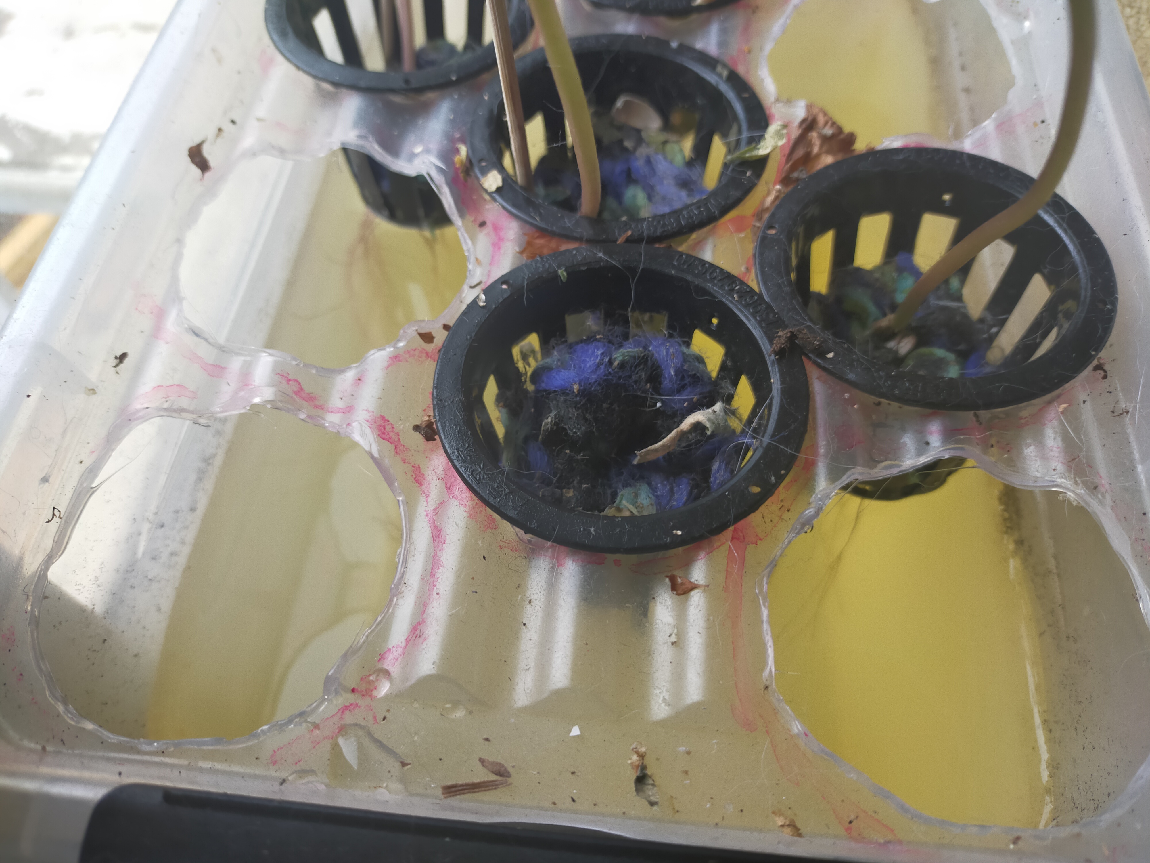 In de plastik bak heb ik gaten gemaakt (met soldeerbout) ter grootte van de binnenmaat van de hydroponic potjes.